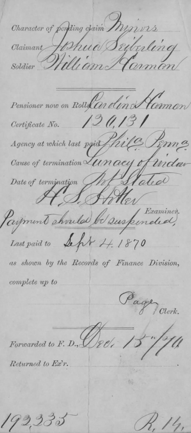 Caroline Herman’s U.S. Civil War Widow’s Pension Claim, Allegations Re Lunacy of Widow, 1870, pp. 1-2_U.S. Civil War Widows’ and Orphans’ Pension Files_pubdom