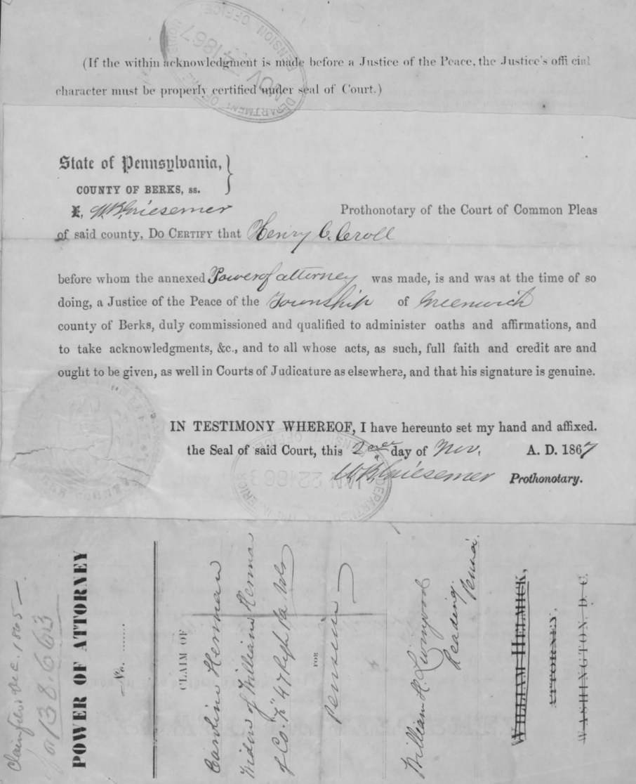 Caroline Herman’s U.S. Civil War Widow’s Pension Claim, Power of Attorney, 1867, p. 2_pubdom
