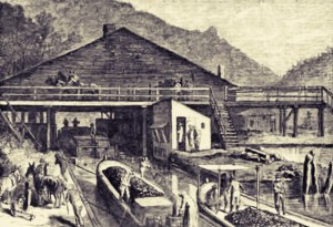 Canal boats moving coal through a Lehigh Canal lock, Lehigh County, Pennsylvania, circa mid-1800s (public domain).