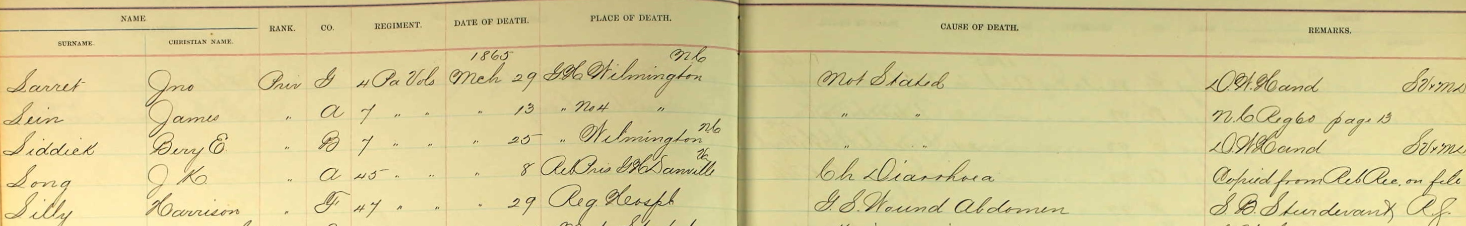 - Lilly, Harrison, in “Registers of Deaths of Volunteers,” in Records of the U.S. Adjutant General’s Office. Washington, D.C.: U.S. National Archives and Records Administration, 1865.