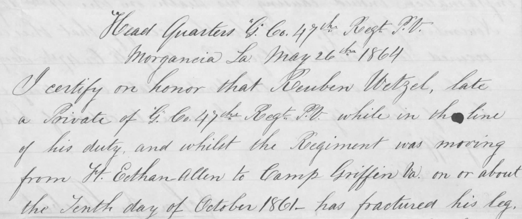Morgancia [sic] La. May 26th 1864I certify on honor that Reuben Wetzel, late a Private of “G” Co. Regt. P.V. while in the line of his duty, and whilst the Regiment was moving from Ft. Ethan Allan to Camp Griffin, Va. on or about the tenth day of October 1861 has fractured his leg, the facts and circumstances attending the breaking of his leg are as follows: The said Reuben Wetzel Private was at the time detailed as Company Cook, the Cooking Utensils being all loaded on the wagons, and the Company Cooks ordered to remain in charge of them, to stay with the Train, as it became night and dark, and the roads being bad to march, he got on horse back, on the hind off [sic] horse of his wagon, the wagon where his Cooking apperattus [sic] had been loaded on, and as they crossed a deep ditch the wagon tongue knocked him off from the horse, the front wagon wheel passing over his leg and thus causing the fracturing of the same without any cause or fault of his own, on the 3rd day following he was removed from Camp Griffin Va. to the Union Hospital at Georgetown D.C. Later his leg was amputated; inflamation [sic] ensued causing his death on the 17th day of November, following. I further certify that this catastrophy [sic] occured [sic] to Reuben Wetzel Private of “G” Co. 47th Regt. Pa. Vols. while in the service of the United States and acting in the line of his duty and in obedience to orders of his Commanding Officer.