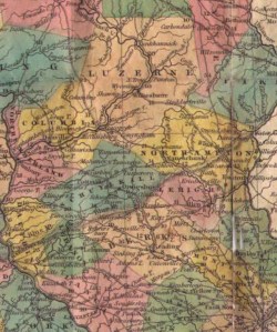 Commonwealth of Pennsylvania map, 1837 (excerpt showing Berks, Lebanon, Lehigh, Luzerne, Montgomery, Northampton, and Schuylkill counties, U.S. Library of Congress, public domain; click to enlarge).