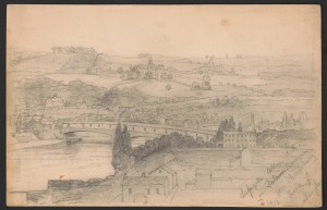 Lafayette College and the Delaware Bridge, viewed from Philipsburg Rock in New Jersey, 1850 (James Fuller Queen, public domain; click to enlarge).