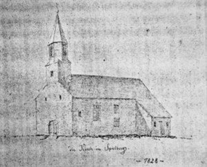 The Evangelische Kirche Spielberg in the Kingdom of Württemberg, shown here circa early 1800s, was the church where William Hensler’s parents were married prior to their emigration from what is now southwestern Germany (public domain).