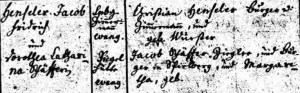 Excerpt from the marriage record of William Hensler’s parents, Jacob Fridrich Henseler and Dorothea Catharina Schäffer, Evangelische Kirche, Spielberg, Kingdom of Württemberg, 13 June 1816 (public domain; click to enlarge).