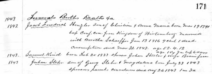 Death Record of William Hensler’s Father, Jacob Friedrich Hensler, St. John’s Lutheran Church, Easton, Pennsylvania, 31 March 1843 (public domain).