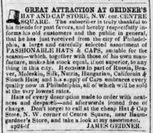 Advertisement for the hat shop of James H. Geidner, Sr. in Lancaster, Pennsylvania (The Saturday Express, 4 December 1852, public domain; click to enlarge).