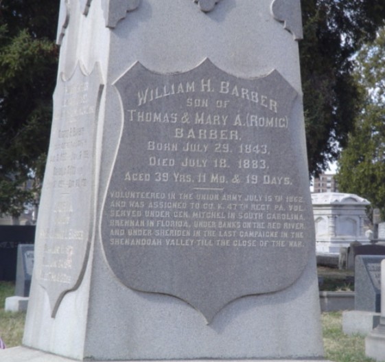 William H. Barber, Sr.’s plaque, Barber Family Monument, Fairview Cemetery, Allentown, Pennsylvania (public domain).