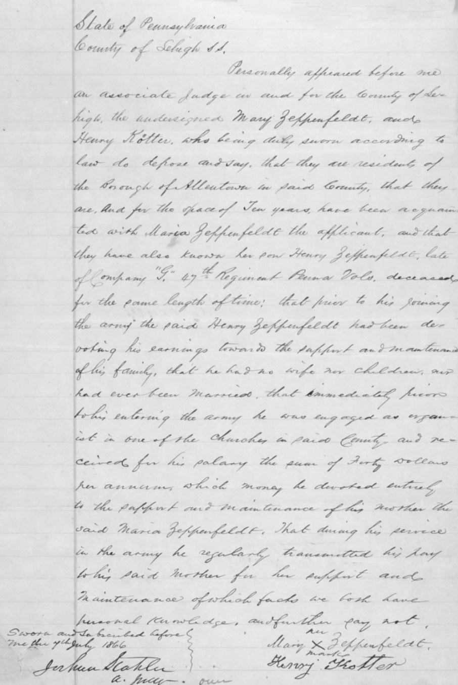Henry Kotter’s Affidavit Filed on Behalf of Maria Zeppenfeld’s U.S. Civil War Mother’s Pension Claim, 7 July 1866, p. 1 (U.S. Civil War Mothers’ Pension Files, U.S. National Archives and Records Administration, public domain).