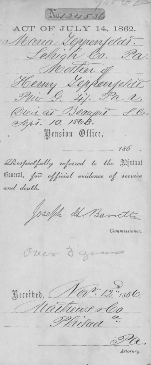 U.S. Pension Bureau’s Certification of Private Henry Zeppenfeld’s Death (U.S. Civil War Mothers’ Pension Files, U.S. National Archives and Records Administration, public domain).