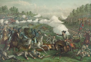 Philip Sheridan’s Union army defeating Jubal Early’s Confederate troops (Kurz & Allison, circa 1893; U.S. Library of Congress, public domain).