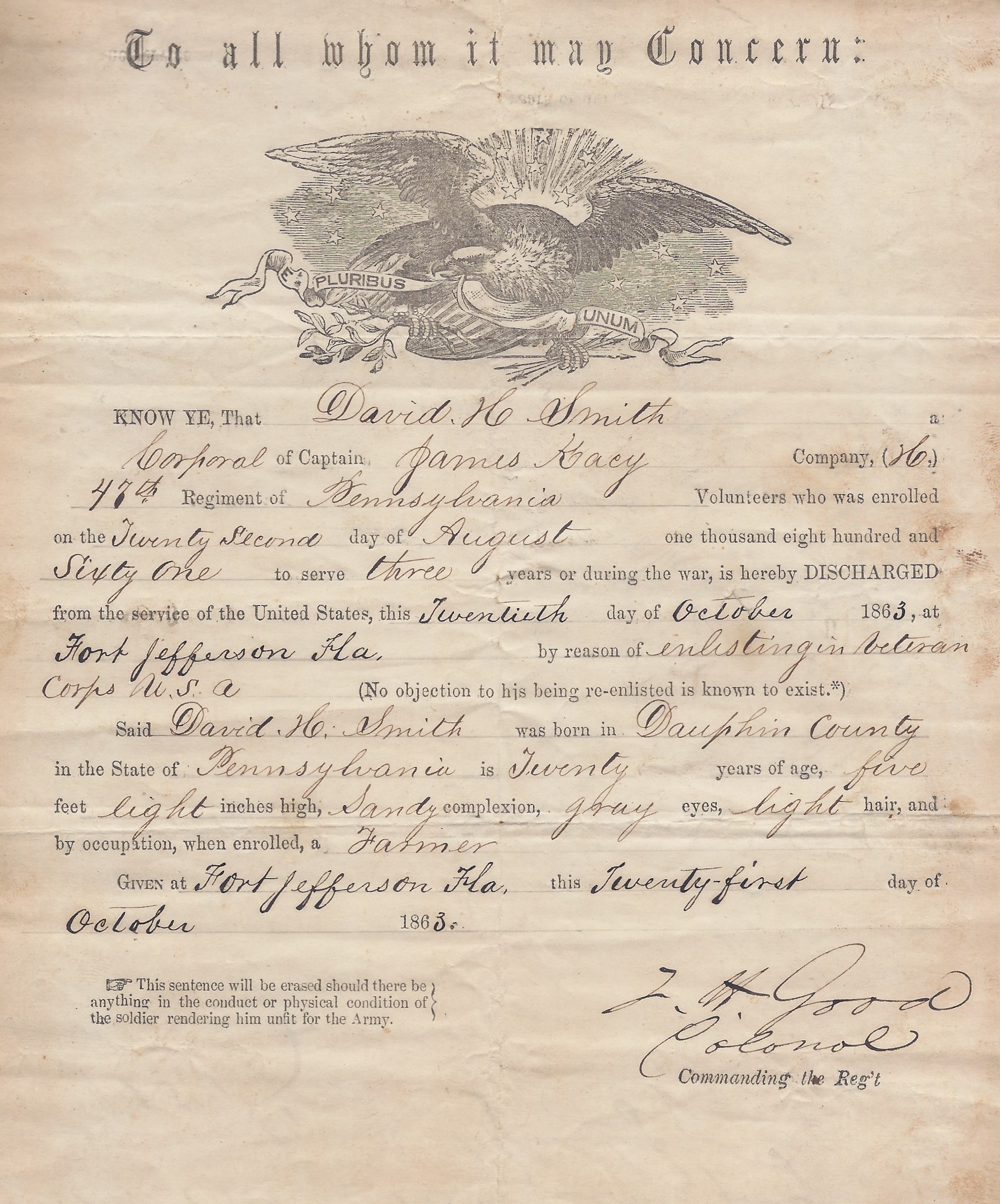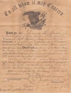 Honorable Discharge paperwork of First Sergeant David H. Smith, Company H, 47th Pennsylvania Volunteers, 25 December 1865 (public domain; click to enlarge).