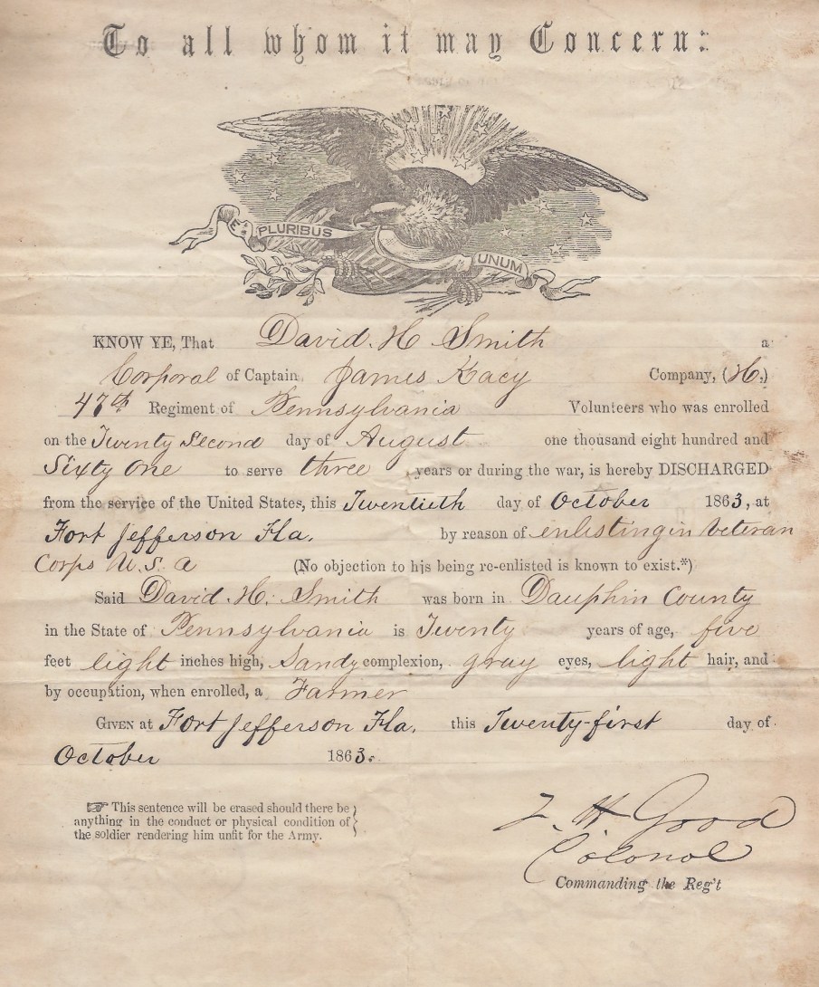 Smith, David H._Co. H, 47th PA_1863 Reenlistment_pubdom Published January 27, 2024 at 2114 × 2545 in Document Gallery: U.S. Civil War Military Paperwork of First Sergeant David H. Smith ← Previous Next → Reenlistment Paperwork, Fort Jefferson, Florida, 1863 (public domain) Like Loading... Trackbacks are closed, but you can post a comment.