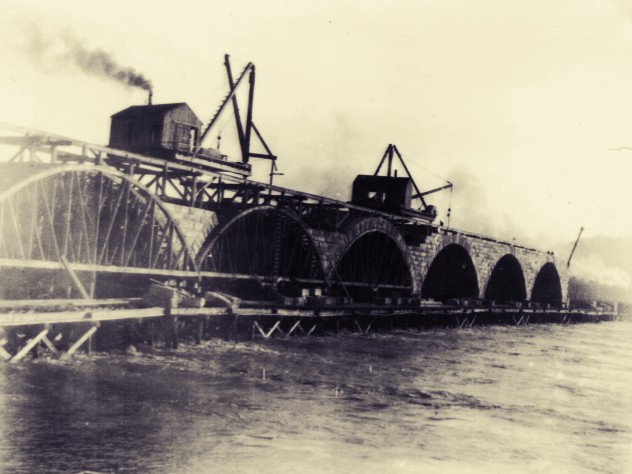 Construction work on the new Marysville Bridge (also known as the Rockville Bridge) in Pennsylvania, circa 1900 (public domain).