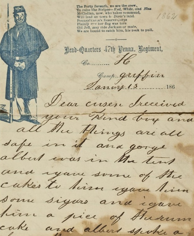 On 15 January 1862, Private Jerome Bryner recapped the regiment’s status in his own letter home to Elliottsburg—this one penned to George M. Bryner, the cousin with whom he had resided in 1860: