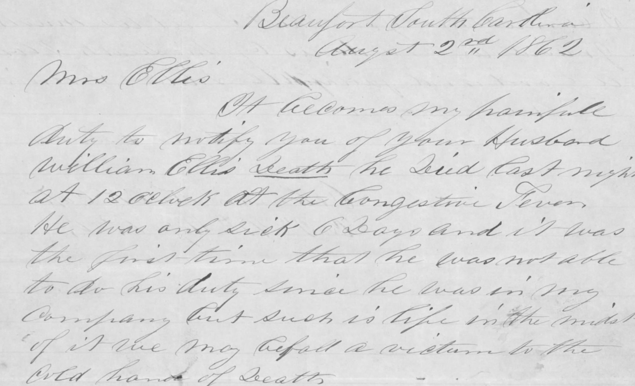It becomes my painful duty to notify you of your Husband William Ellis’ death he died last night at 12 o’clock of the Congestive Fever. He was only sick 6 days and it was the first time that he was not able to do his duty since he was in my company but such is life in the midst of it we may befall a victim to the cold hand of death.
