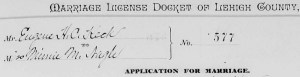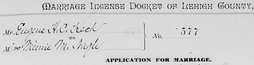 11. Keck, Eugene H. C., Minnie Nagle, Coleman and Catharine Keck, in Marriage License Docket of Lehigh County, Pennsylvania. Allentown, Pennsylvania: Lehigh County Orphans’ Court, 1886.
