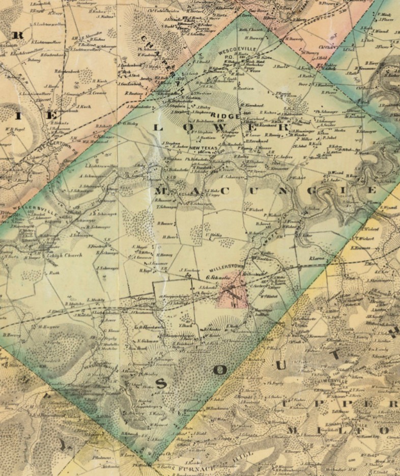 Excerpt, map of Lower Macungie Township, Lehigh County, Pennsylvania, showing the town of Millersville, now known as Macungie (G. A. Aschbach, 1862, public domain; click to enlarge).