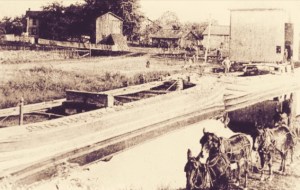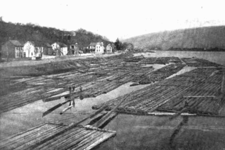 Log rafts moved through the Susquehanna River’s west branch as they passed Lock Haven, Pennsylvania, circa 1880s (John W. C. Floyd, public domain; click to enlarge).