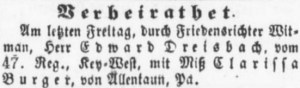 10. Edward Dreisbach and Clarissa Burger (marriage notice). Allentown, Pennsylvania, Der Lecha Caunty Patriot, 16 December 1863.