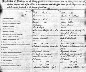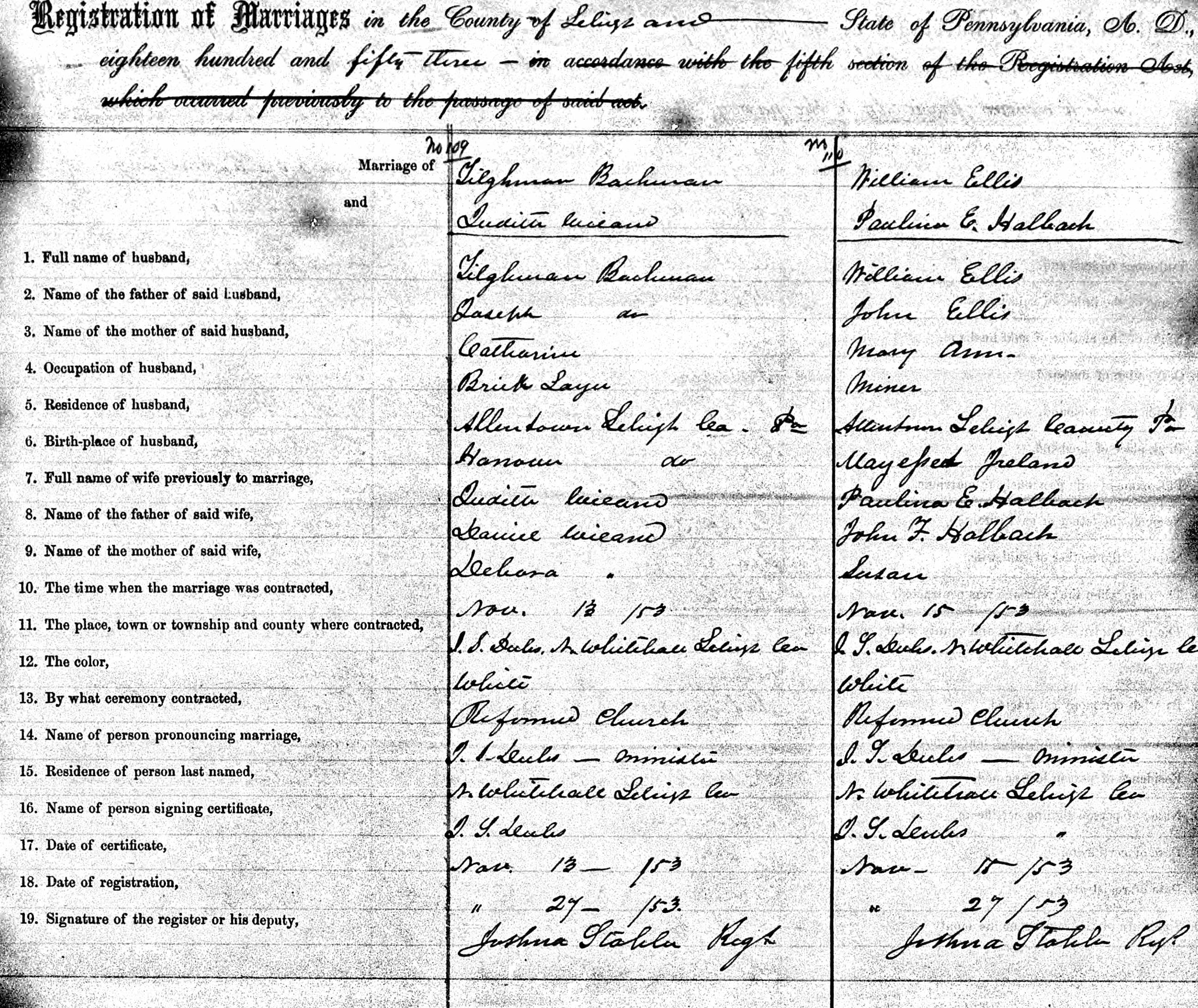 Excerpt of 1853 Lehigh County, Pennsylvania marriage ledger page documenting the marriage of William Ellis and Pauline Halbach (see right column; public domain).