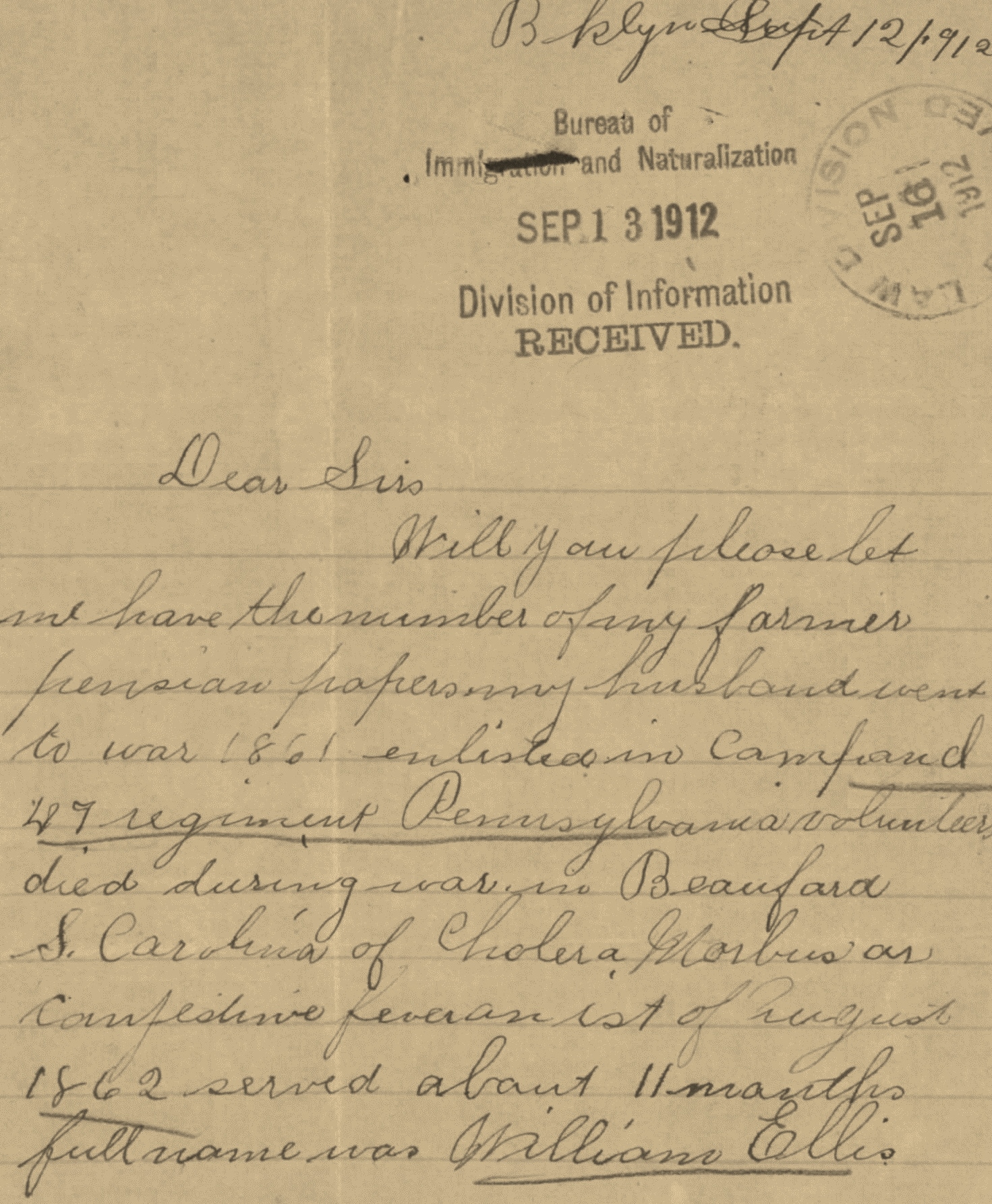 In reply to your letter of the 12th instant, addressed to the Bureau of Immigration and Naturalization, and by that Bureau referred to this office, where it was received the 16th instant, you are advised that you were formerly pensioned as widow of the above named soldier [William Ellis, Pvt., Co. I, 47th Pennsylvanis Vols.] by certificate no. 8,170.