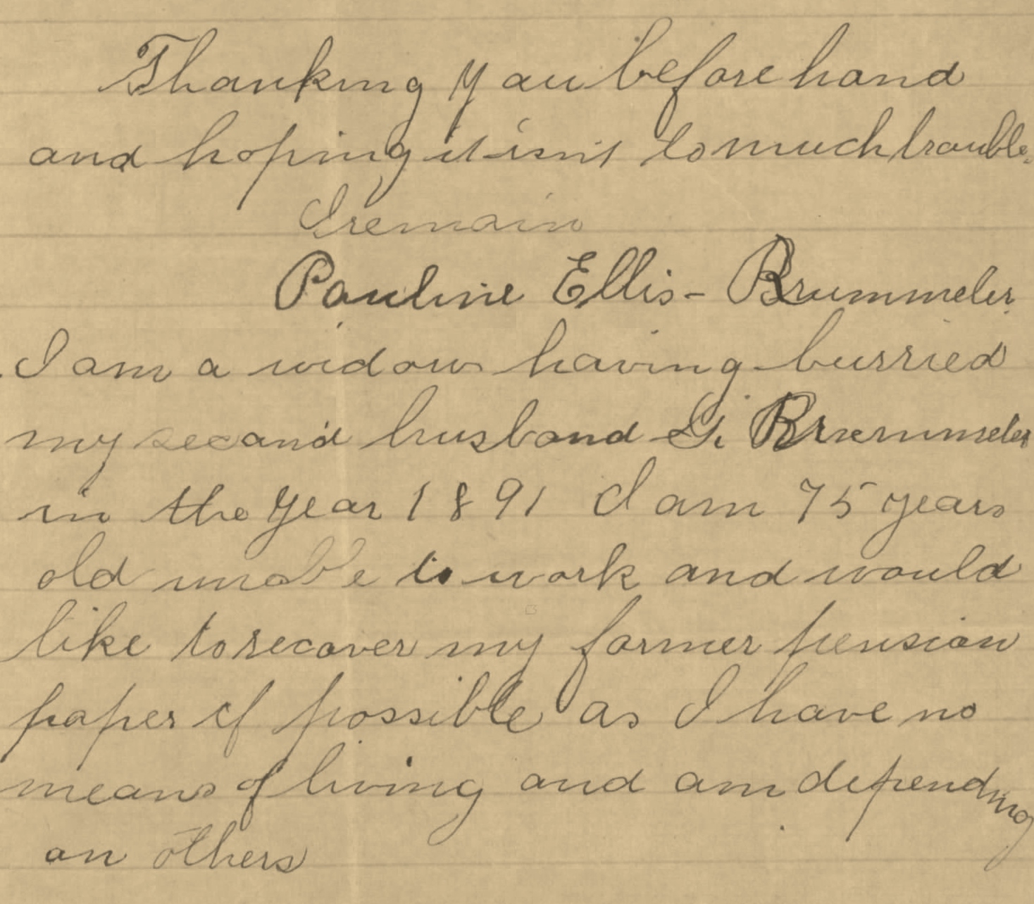 “I am a widow having buried my second husband…. I am 75 years old unable to work and would like to recover my former pension paper if possible as I have no means of living and am dependent on others.”