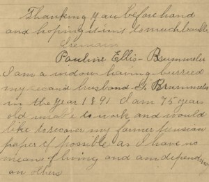 Excerpt of 1912 letter from Pauline Ellis Rummeler, widow of Private William Ellis, Company I, 47th Pennsylvania Volunteers, to the U.S. Government, requesting restoration of her Civil War Widow’s Pension (p. 2, public domain).