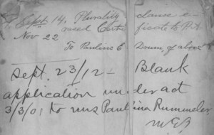 Excerpt of Pauline Ellis Drum’s Civil War Widow’s Pension jacket showing her corrected remarriage surname spelling as “Rummeler” (c. 1912, public domain).
