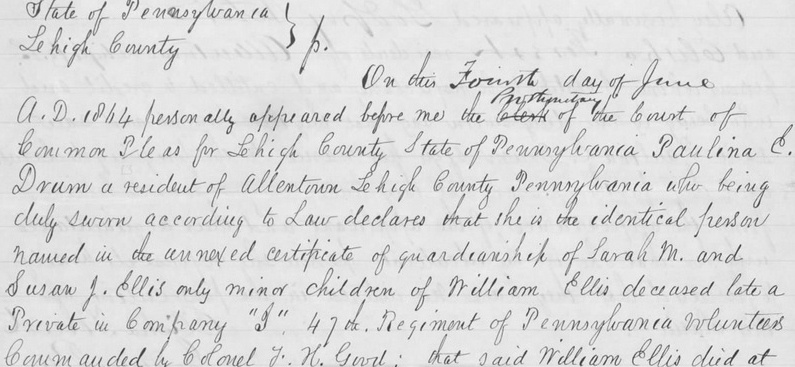 Excerpt of June 1864 testimony by “Paulina (Halbach) Ellis Drum” to the Prothonotary, Lehigh County, Pennsylvania Court of Common Pleas that she was the widow of Private William Ellis, Company I, 47th Pennsylvania Volunteers, and mother of two of his daughters, Sarah and Susanna (public domain).