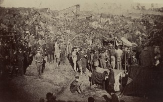 Issuing Rations at the Andersonville POW Camp, 17 August 1864 (view from main gate, U.S. Library of Congress, public domain).