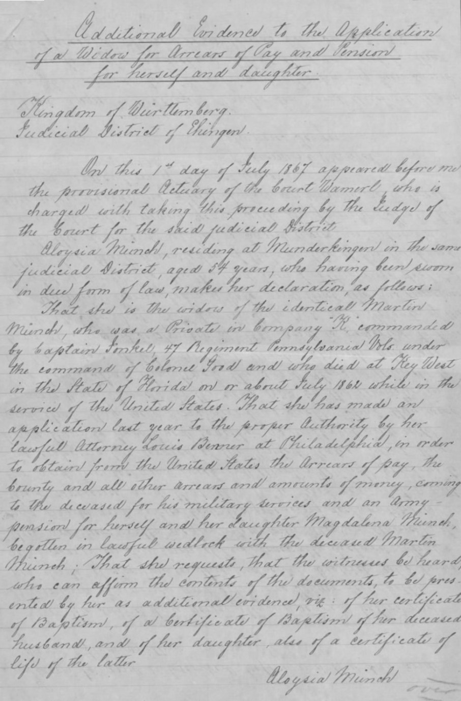 Aloisia Munch’s U.S. Civil War Widow’s Pension Claim (letter, additional evidence, 1 July 1867, p. 1, English translation, U.S. Civil War Widows’ Pension Files, U.S. National Archives and Records Administration, public domain).