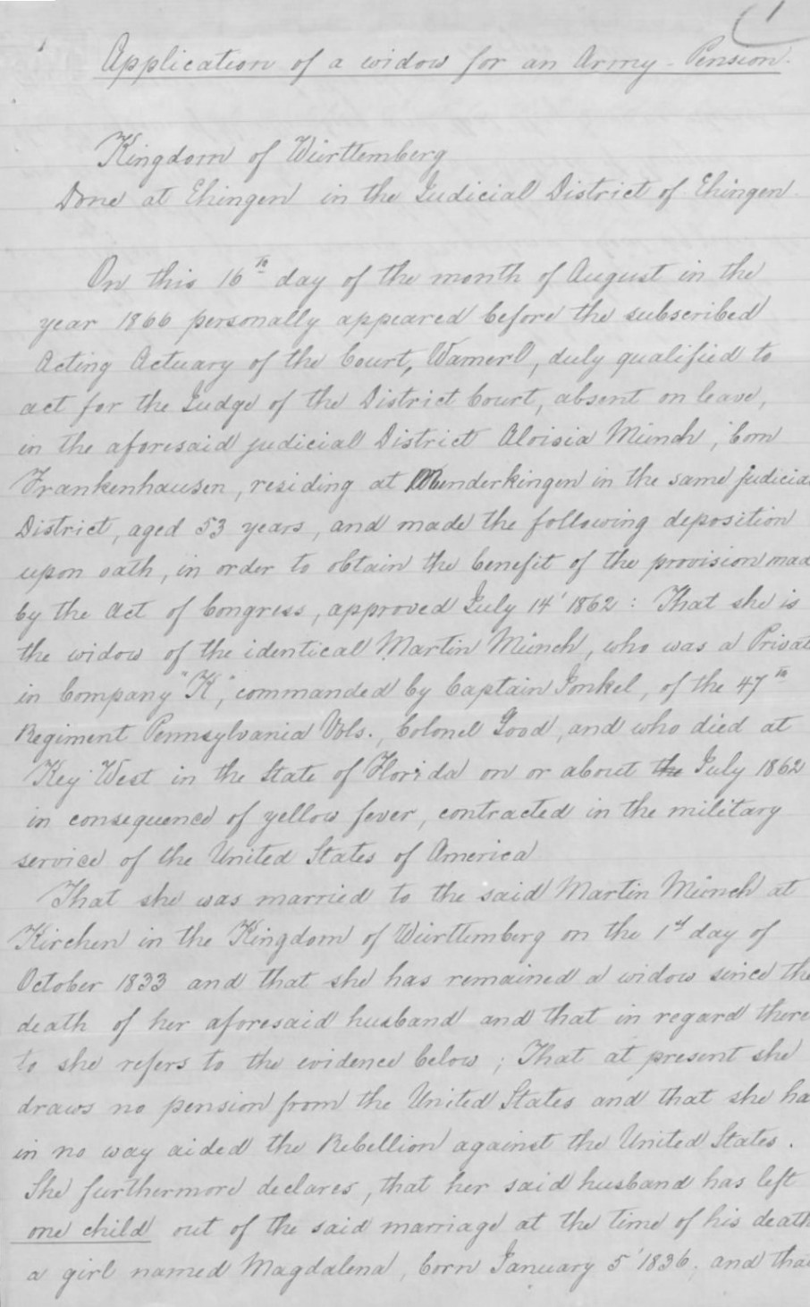 Aloisia Munch_U.S. Civil War Widow’s Pension Claim, app for widow’s pension, 13 Aug 1866, p. 1_original German and E nglish translation_pubdom