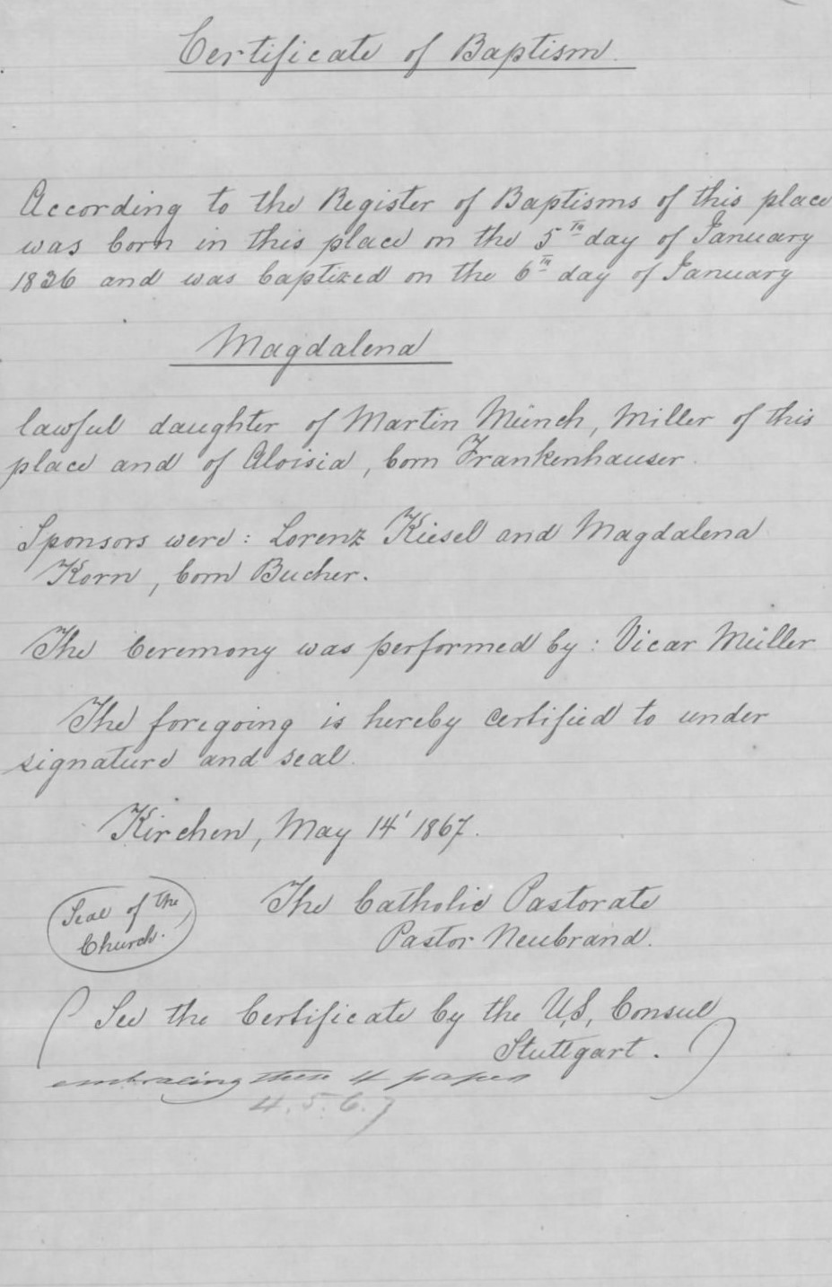 Taufschein-Baptismal Records of Magdalena Münch (English transcription, U.S. Civil War Widow’s Pension File of Aloisia Münch, U.S. National Archives and Records Administration, public domain).