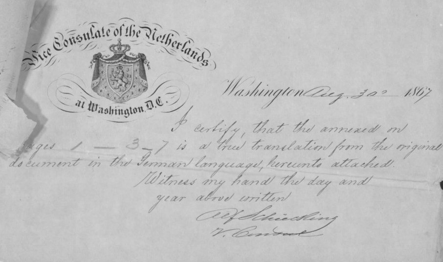 Aloisia Munch’s U.S. Civil War Widow’s Pension Claim, Certificate, German Consular Agency and Vice Consul of the Netherlands, Washington, D.C., 30 Aug 1867, pubdom