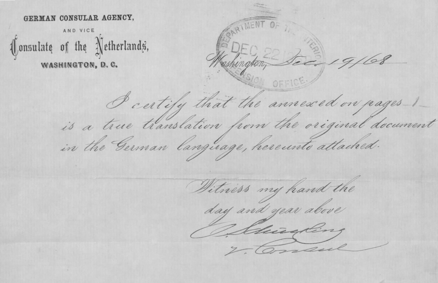 Aloisia Munch’s U.S. Civil War Widow’s Pension Claim, Certificate, German Consular Agency, Washington, D.C., 22 Dec 1868_pubdom
