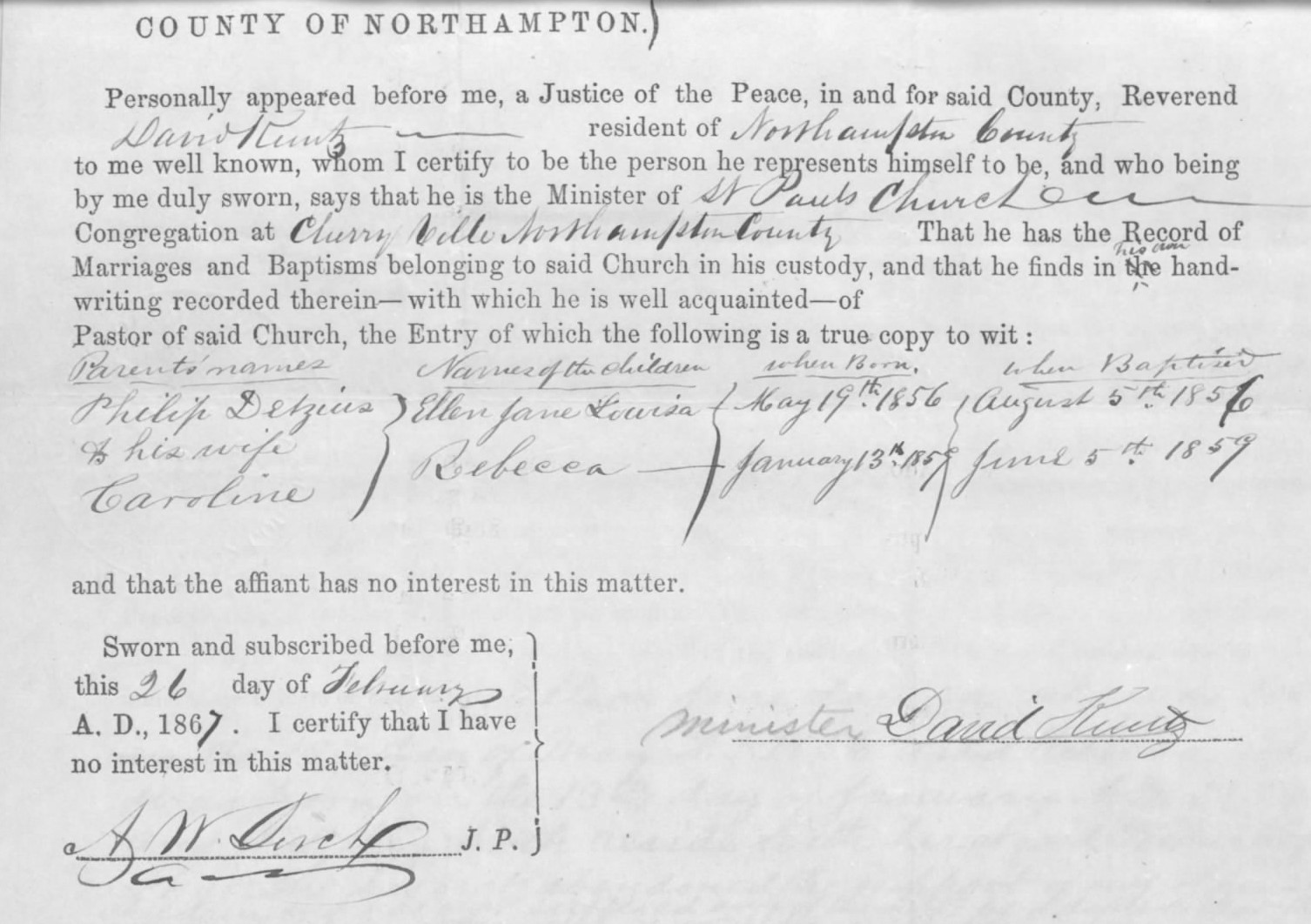 Minister’s Feb 1867 Attestation re the Births and Baptisms of the Children of Philip and Caroline Detzius or Detzins