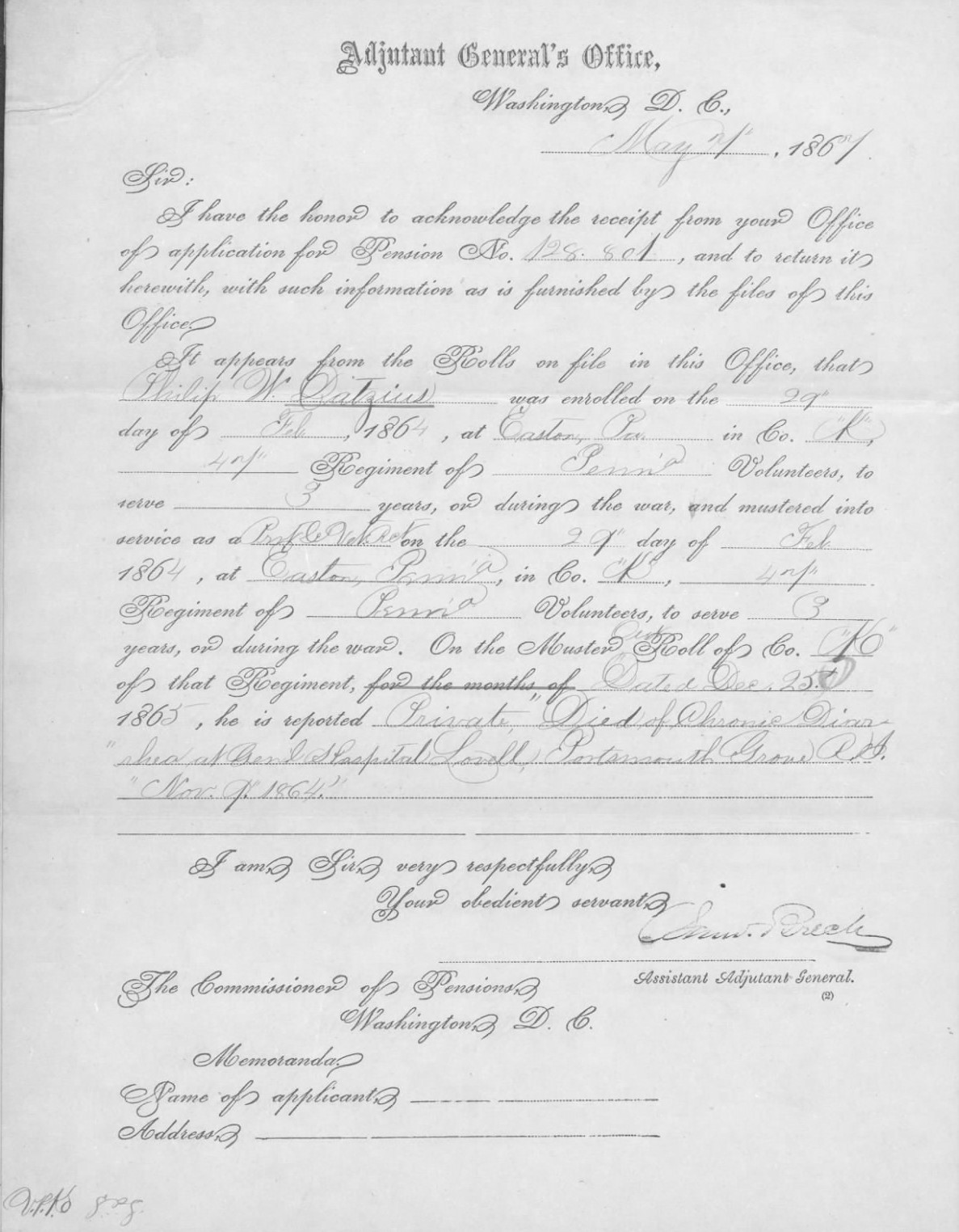 U.S. Adjutant General’s 4 May 1867 letter confirming the 1864 army-related service death of Private Philip W. Datzius, Co. K, 47th Pennsylvania Volunteer Infantry (Records of the U.S. Adjutant General, U.S. National Archives and Records Administration, public domain).