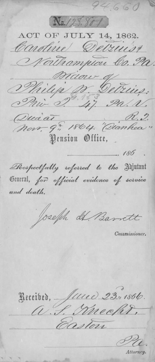 U.S. Pension Bureau’s 23 June 1866 Confirmation of the 1864 Death of Philip Datzius