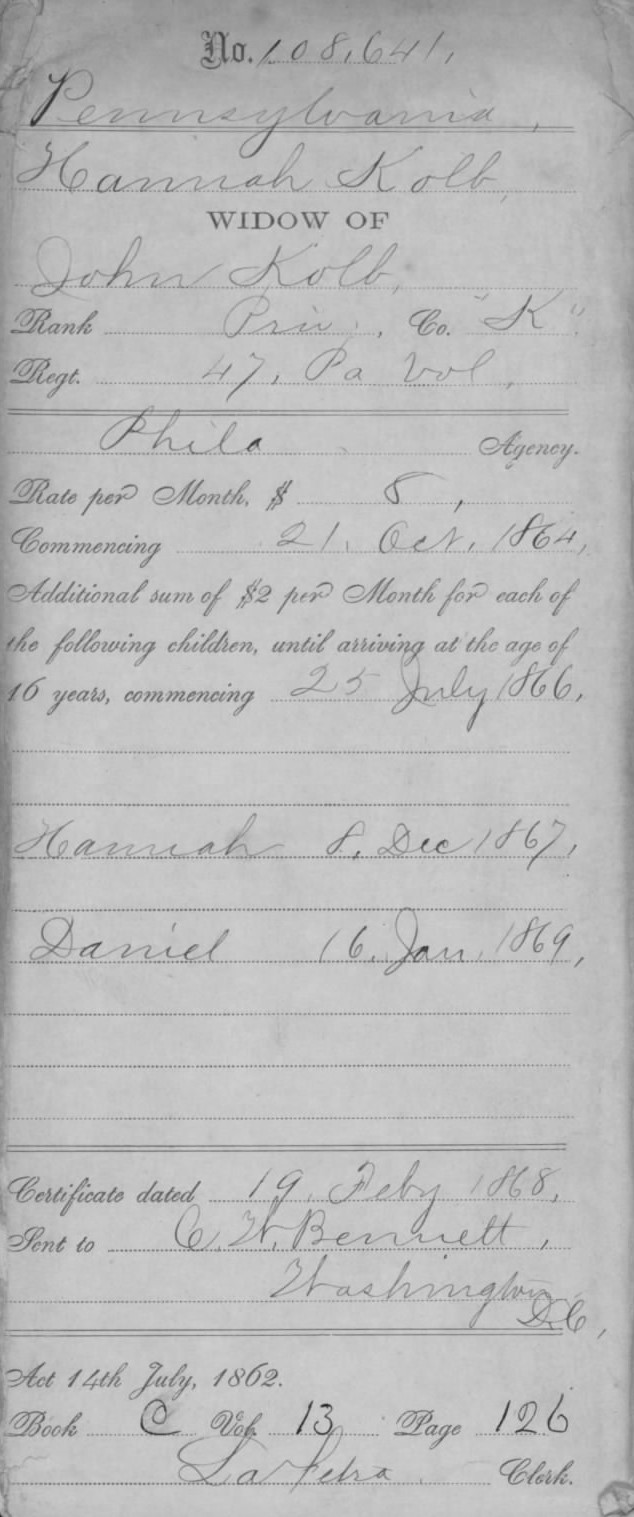 Hannah Kolb_U.S. Civil War Widow’s Pension Claim History and Award Date and Amount, 13-19 Feb 1868_pubdom