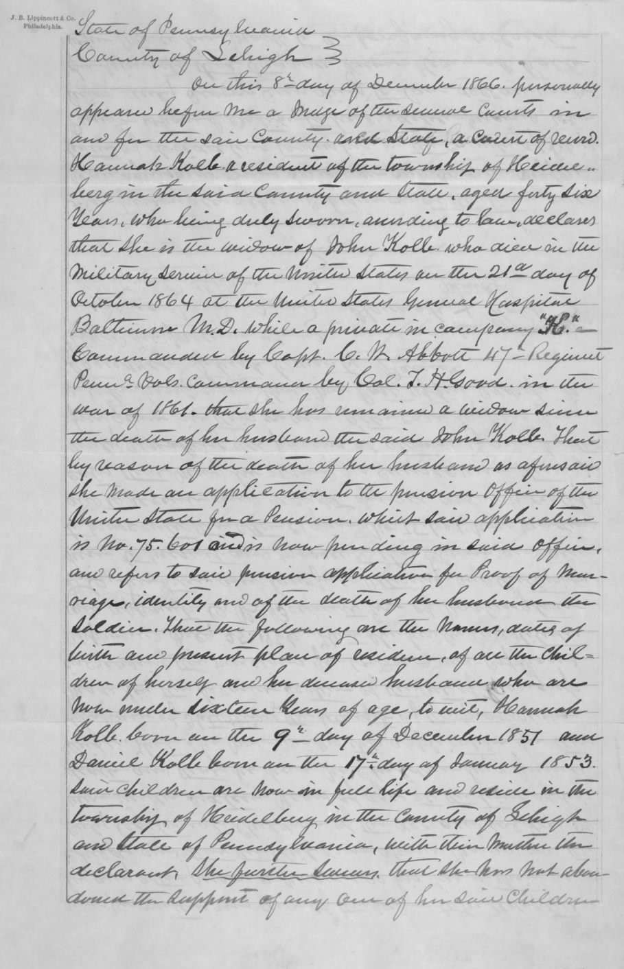 Hannah Kolb_U.S. Civil War Widow’s Pension Claim, Hannah’s 8 Dec 1866 Affidavit, pp. 1-3