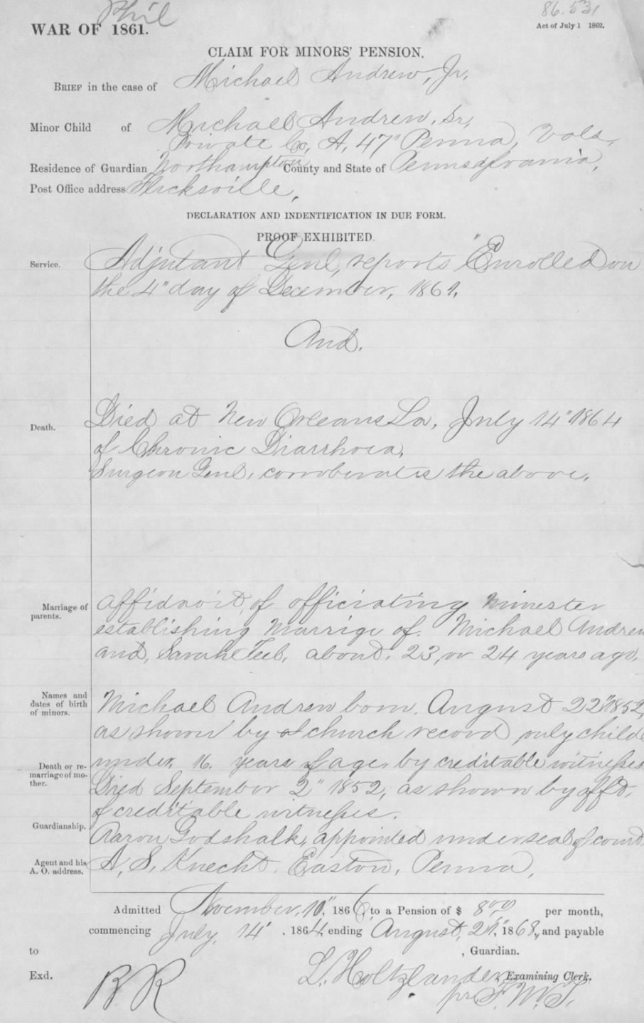 Pvt. Michael Andrew, Sr.’s Death and Michael Jr.’s Orphan’s Pension App. p. 1_pubdom