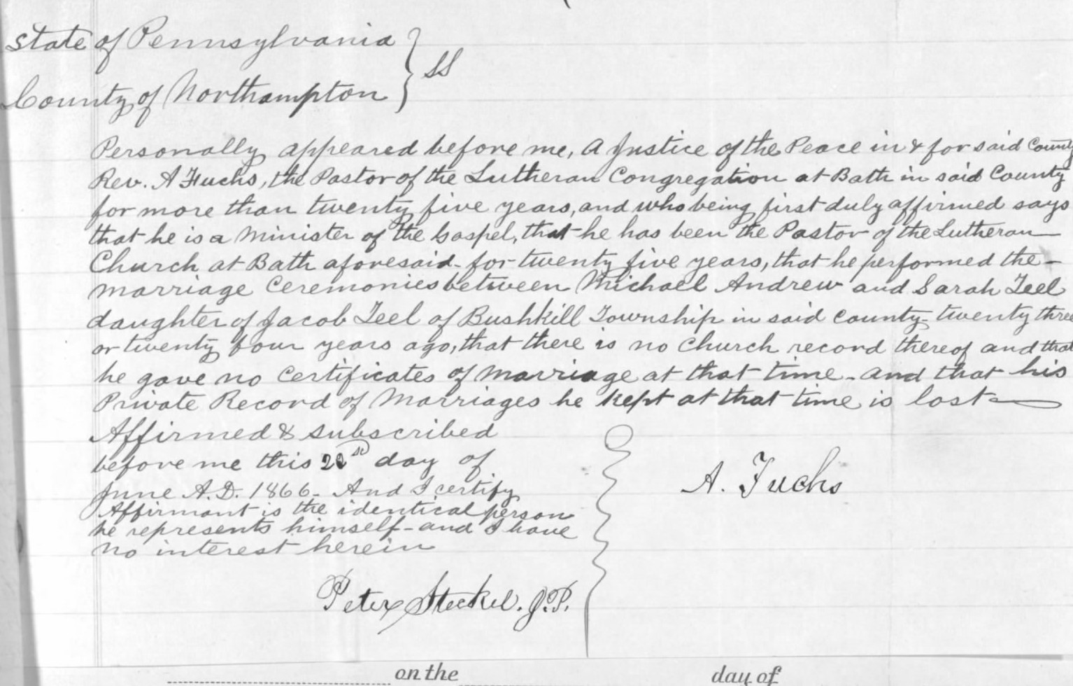 Attestation by Rev. A. Fuchs of Michael Andrew, Sr.’s Marriage to Sarah Teel (U.S. Civil War Orphans’ Pension Files, U.S. National Archives and Records Administration, public domain).