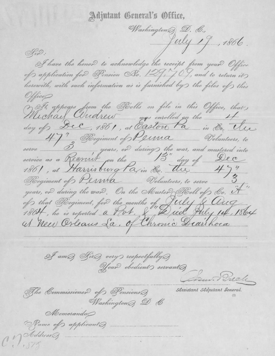 Private Michael Andrew, Sr.’s 1864 Death Certified by the U.S. Adjutant General (U.S. Civil War Orphans’ Pension Files, U.S. National Archives and Records Administration, public domain).