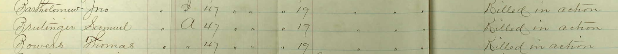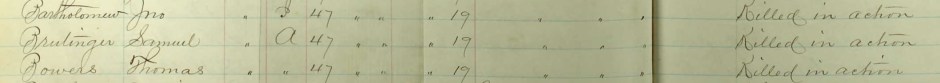 A U.S. Army death ledger documented the combat death of Private Samuel Breidinger, Co. A, 47th Pennsylvania Volunteers in the Battle of Cedar Creek, Virginia (19 October 1864, public domain, double click to enlarge).