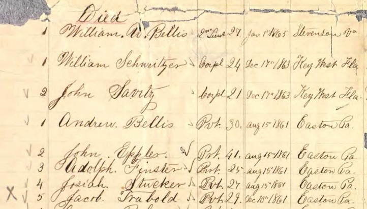 Then, a truly shocking incident occurred. On 15 May 1863, Private Adolph Finster of Company A died by suicide in Key West. His death, which was certified by the 47th Pennsylvania’s assistant regimental surgeon, William F. Reiber, M.D., was entered onto a ledger that later became part of the U.S. Army’s “Registers of Deaths of Volunteers.” It documented his name, rank, regiment, company, and date of death, as well as his cause of death: “Suicidum.” (A muster-out roll that was later completed by Company A clerks at the 47th Pennsylvania’s final muster out in Charleston, South Carolina on 25 December 1865 documented the tragic event with this simple notation: “Committed suicide. May 15th 1863 at Key West Fla.”)