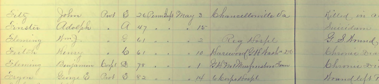 The date and cause of death of Private Adolph Finster, Company A, 47th Pennsylvania Volunteer Infantry (Registers of Deaths of Volunteers, May 1863, U.S. Army and U.S. National Archives and Records Administration, public domain; click to enlarge).