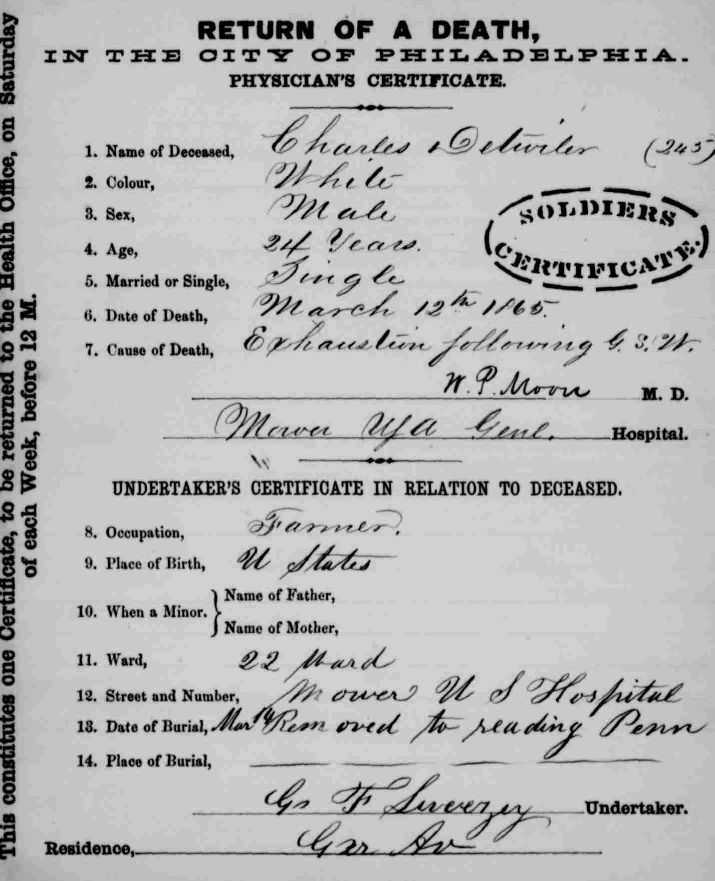 His cause of death was described by W. P. Moore, M.D. on the physician’s death certificate filed with the City of Philadelphia as “Exhaustion following G.S.W.” This same document also noted that Private Charles C. Detweiler had been an unmarried farmer at the time of his passing.