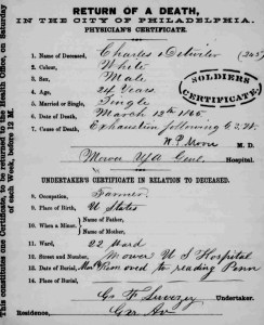 Death Certificate for Private Charles C. Detweiler, 12 March 1865, City of Philadelphia, Pennsylvania (public domain).