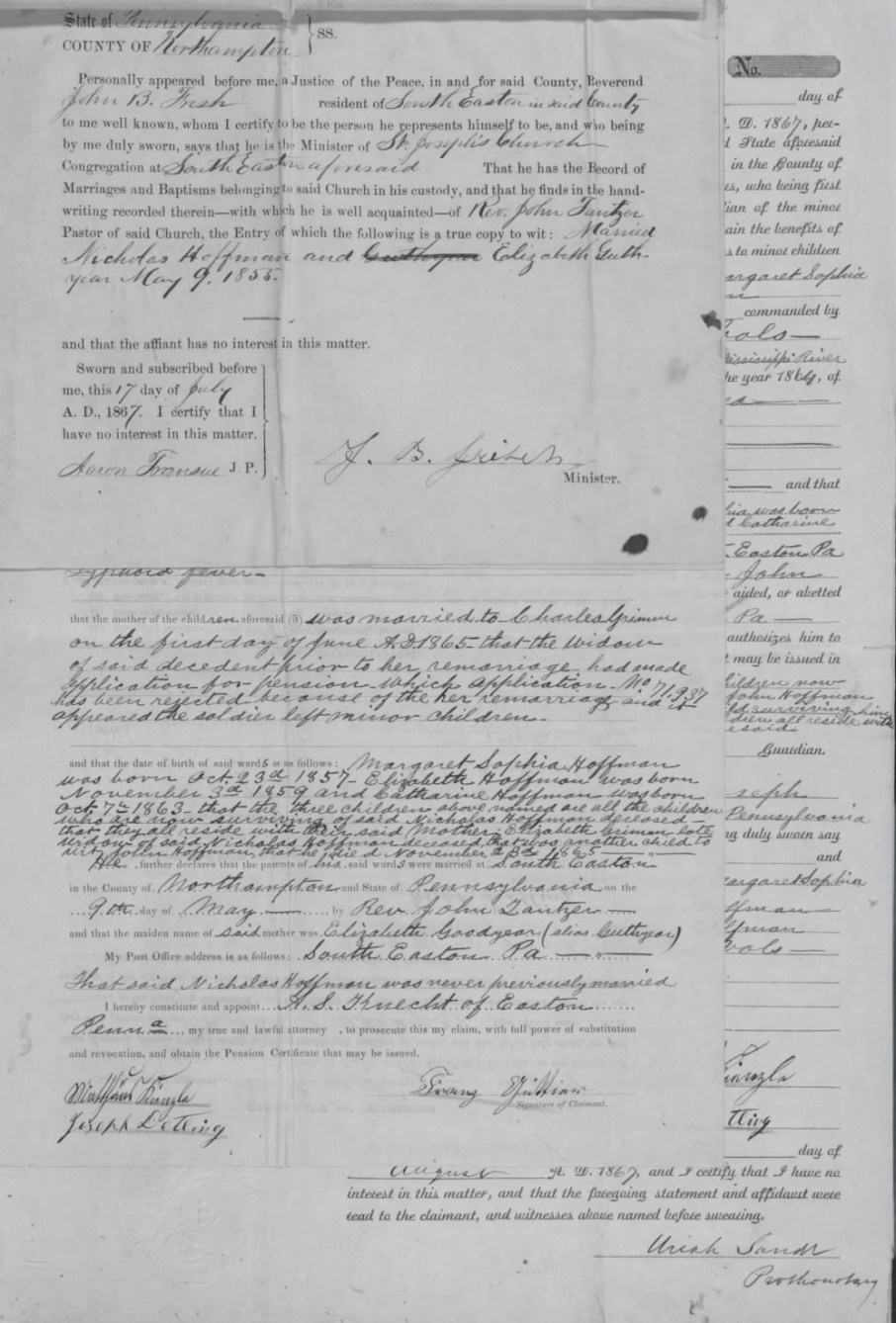 Rev. Frisch’s 17 July 1867 Attestation Re the 1855 Marriage of Nicholas Hoffman and Elizabeth Goodyear